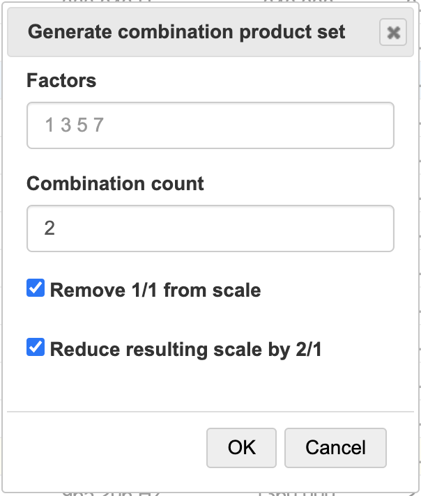 Create a scale by multiplying harmonics in different combinations. Optionally, the resulting scale can be reduced by 2/1 and sorted in ascending order.
