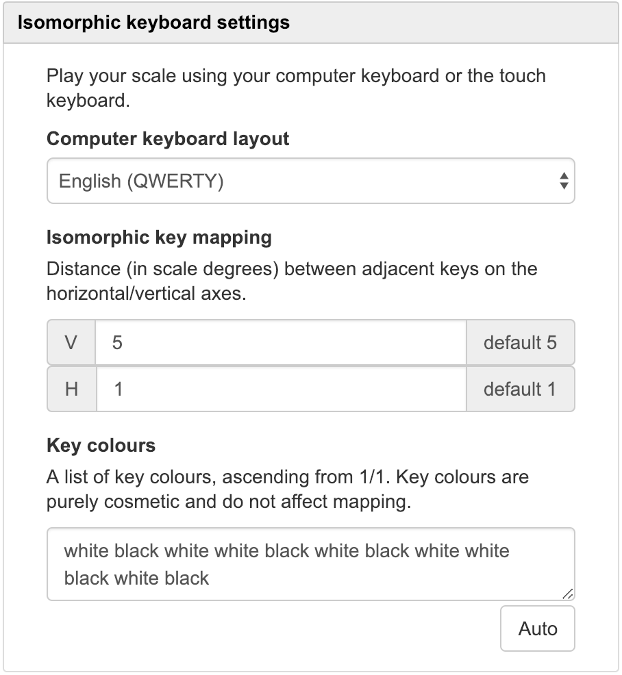 When using the QWERTY or the Virtual keyboard, by default each note along a horizontal axis is 1 scale degree apart and each note along vertical axis is 5 scale degrees apart. This can be changed by using the Isomorphic keyboard settings shown on the right column of the Scale Workshop interface.