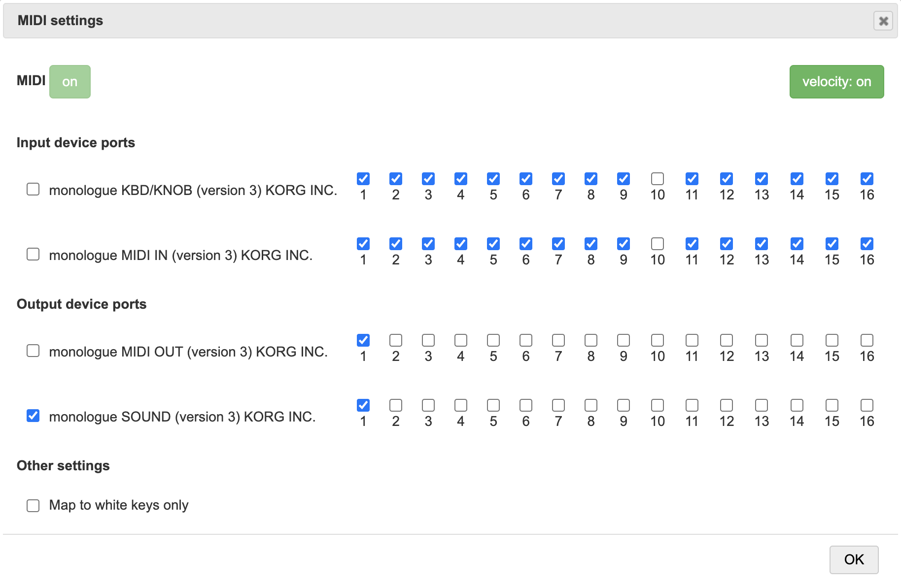 MIDI devices can be enabled or disabled by selecting the check boxes next to each device. Each individual channel can also be enabled or disabled by the check boxes.