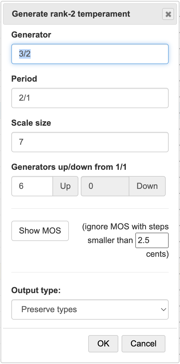 Start by clicking the New option on the top menu bar. Select from equal temperament, rank-2 temperament, etc.