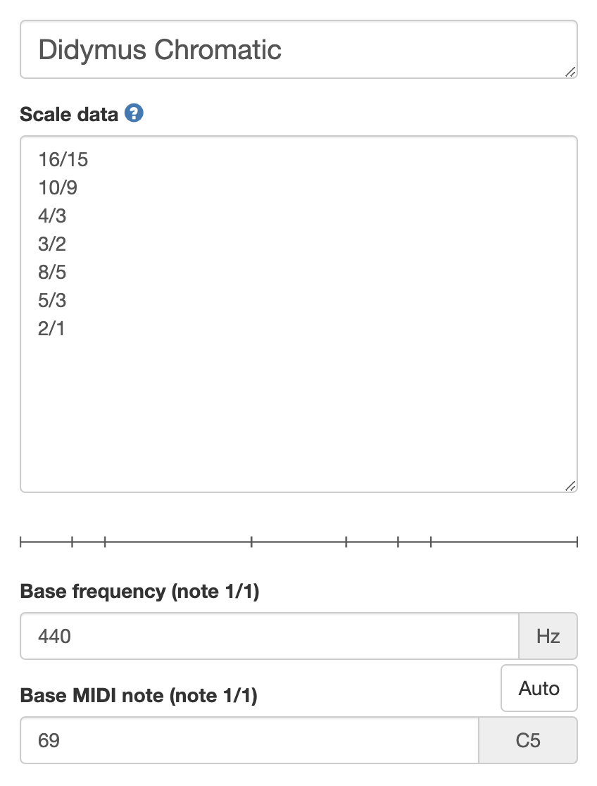 Scales can be written manually by typing them in to the Scale data text field. Enter one interval per line. Do not enter 1/1 on the first line as it is already assumed that the first note is 1/1.